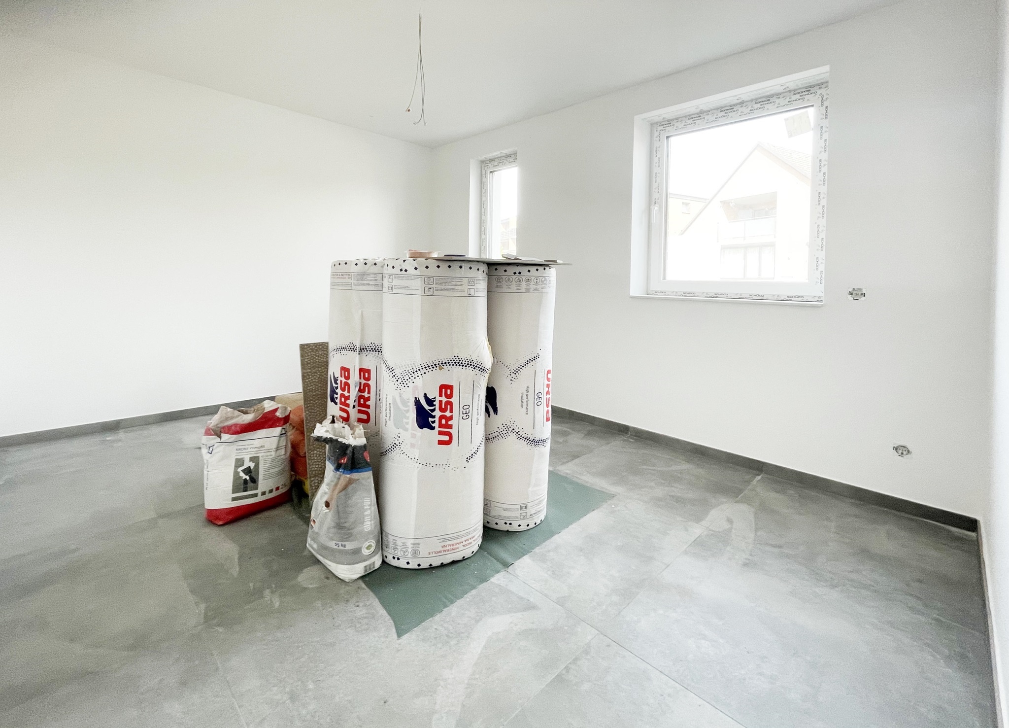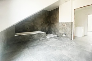 Außerdem gibt es auf dieser Ebene ein Zimmer und ein Gäste-Badezimmer mit bodengleicher Dusche und modernen Sanitärobjekten. Ebenfalls befindet sich in einem Raum die Haustechnik mit Stauraum für Getränke etc. Passend zum modernen Look wurde auch die Treppe als geschlossene Einheit gestaltet, womit weniger Geräusche entstehen. Im Obergeschoss/Dachgeschoss erwarten Sie das große Elternschlafzimmer und zwei kleinere Zimmer, die als Kinder-, Gäste- oder Arbeitszimmer dienen können. Die bodentiefen Fenster lassen viel Licht in die Räumen und stets haben Sie einen schönen Ausblick. Die Dachschrägen schenken den Zimmern eine gemütliche Stimmung. Weiteres Highlight auf dieser Ebene ist das große Tageslicht-Badezimmer mit bodengleicher Dusche, Badewanne, Doppelwaschbecken und formschönen Armaturen. Hier können Sie kleine Wellness-Momente genießen und neue Kraft schöpfen.