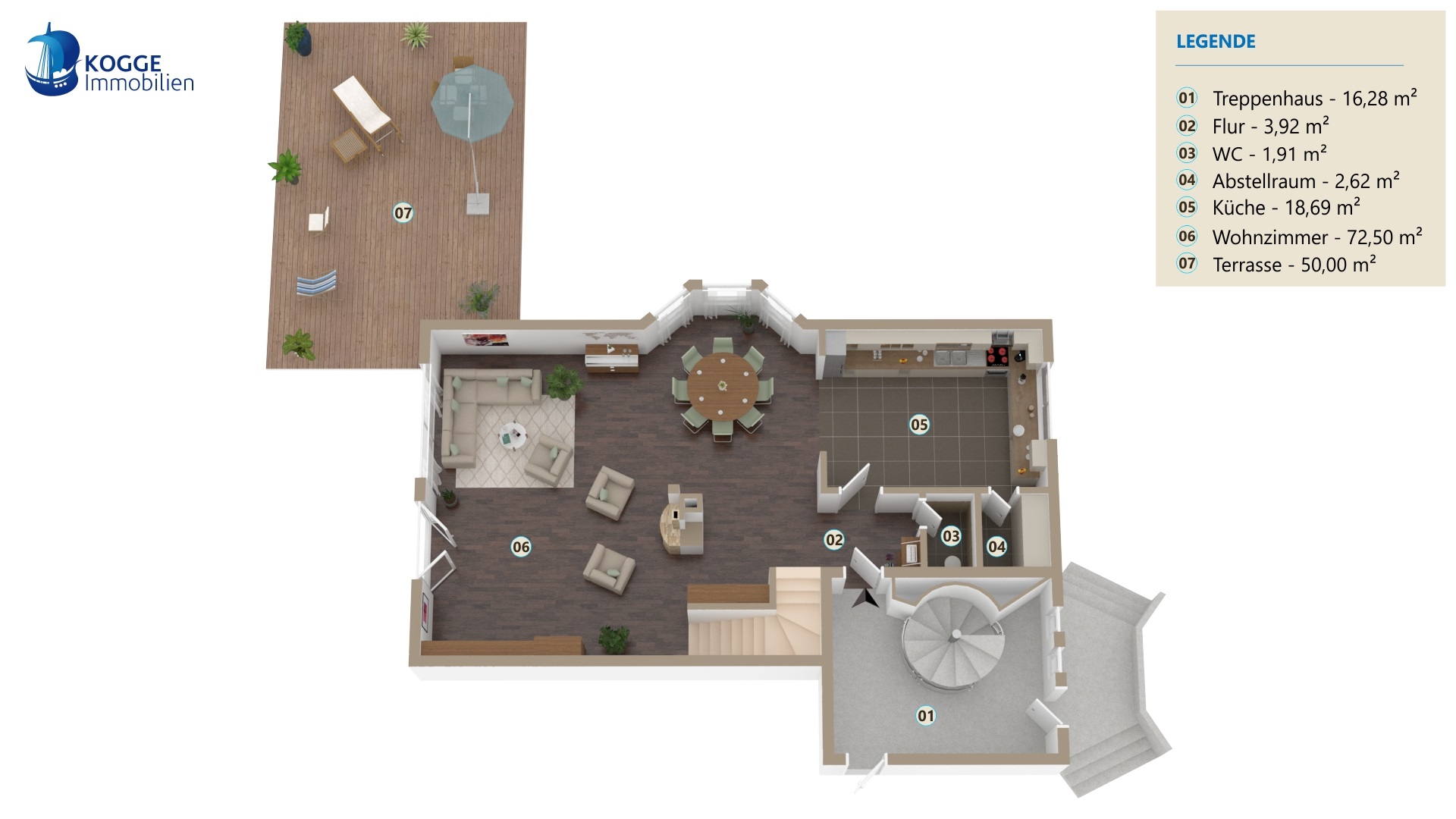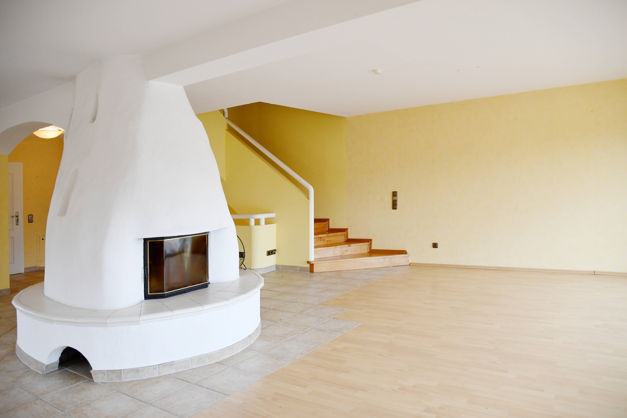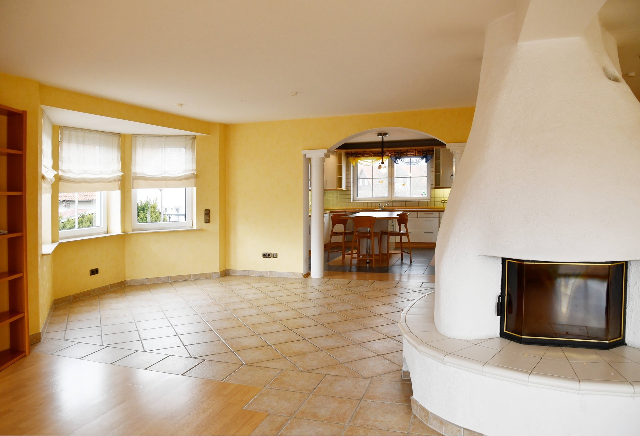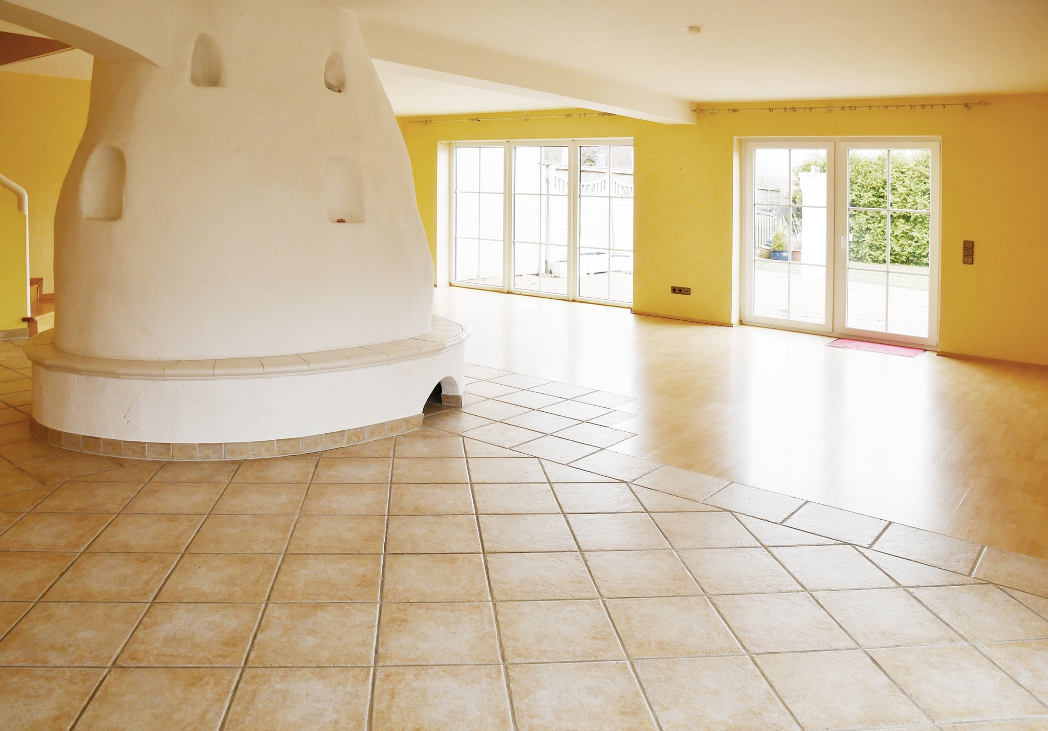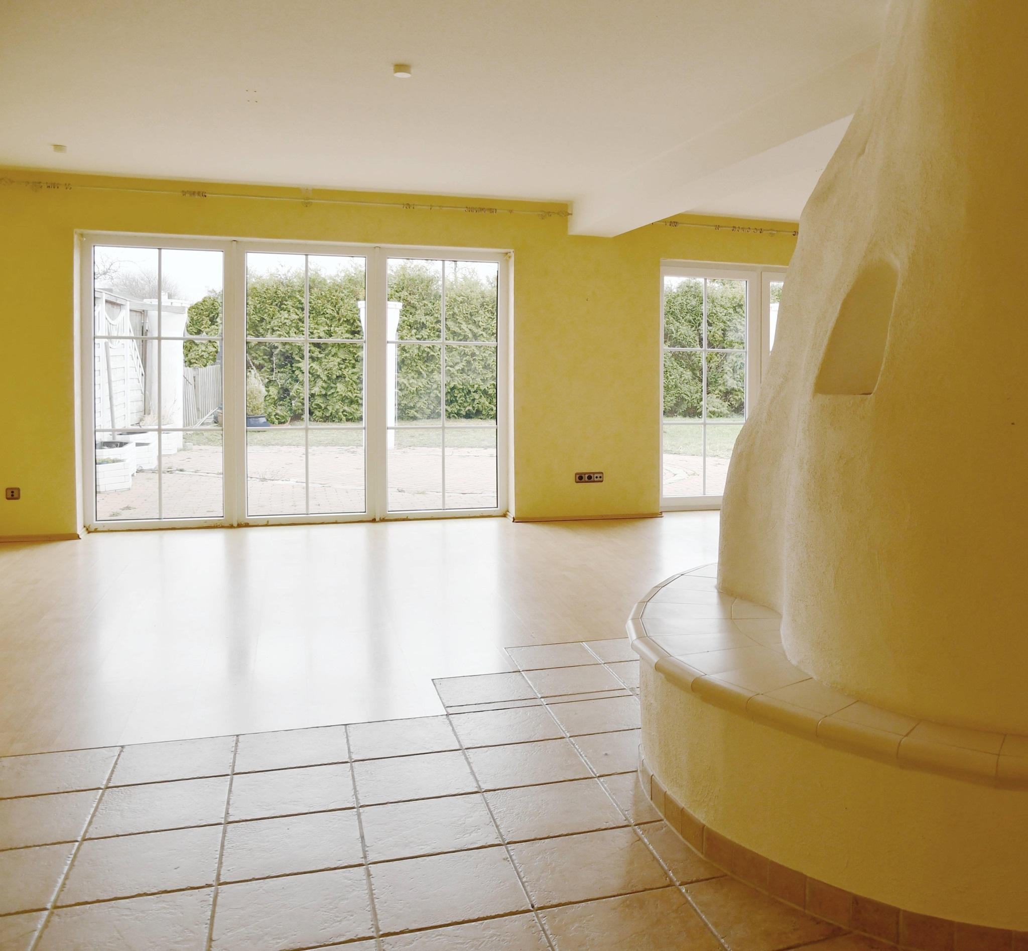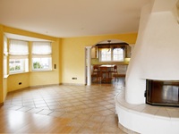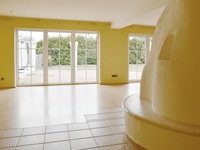Das Herzstück bildet der offene Wohnbereich, denn er besteht aus dem zentral platzierten Kamin, bodentiefen Terrassentüren und seitlichen Erker. Alles atmet Luft und Raum, denn Sie können eine große Sitzlandschaft und einen Esstisch platzieren. Und die Fußbodenheizung sorgt für ein ideales Raumklima. Es laden ein hochwertiges Parkett und der Blick auf die Terrasse zum Verweilen ein. In den Sommermonaten bildet die weitläufige Terrasse eine natürliche Fortsetzung des Wohnbereichs. Sie haben reichlich Platz für Sonnenliegen, Sonnenschirm, Grill und schöne Pflanzen.