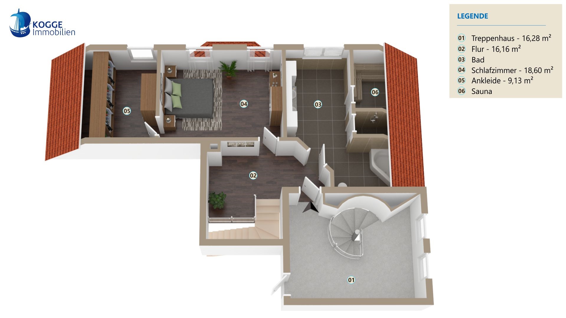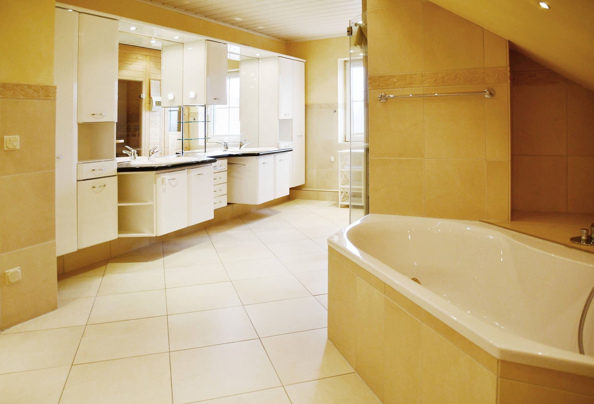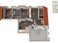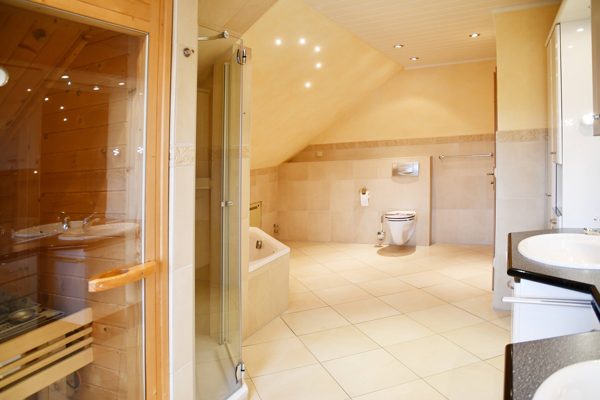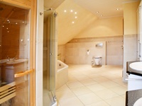 Insgesamt verfügt diese Ebene über circa 99 Quadratmeter. Vom Wohnbereich führt eine seitliche Treppe hinauf zum Schlafzimmer mitsamt separatem Ankleidezimmer und einem WellnessBadezimmer. Es bietet mit eigener Sauna, Dusche, Badewanne, ausgesuchten Fliesen und zwei Waschbecken ein 5 SterneAmbiente. Hier können Sie vom Alltag entspannen und neue Kraft schöpfen.