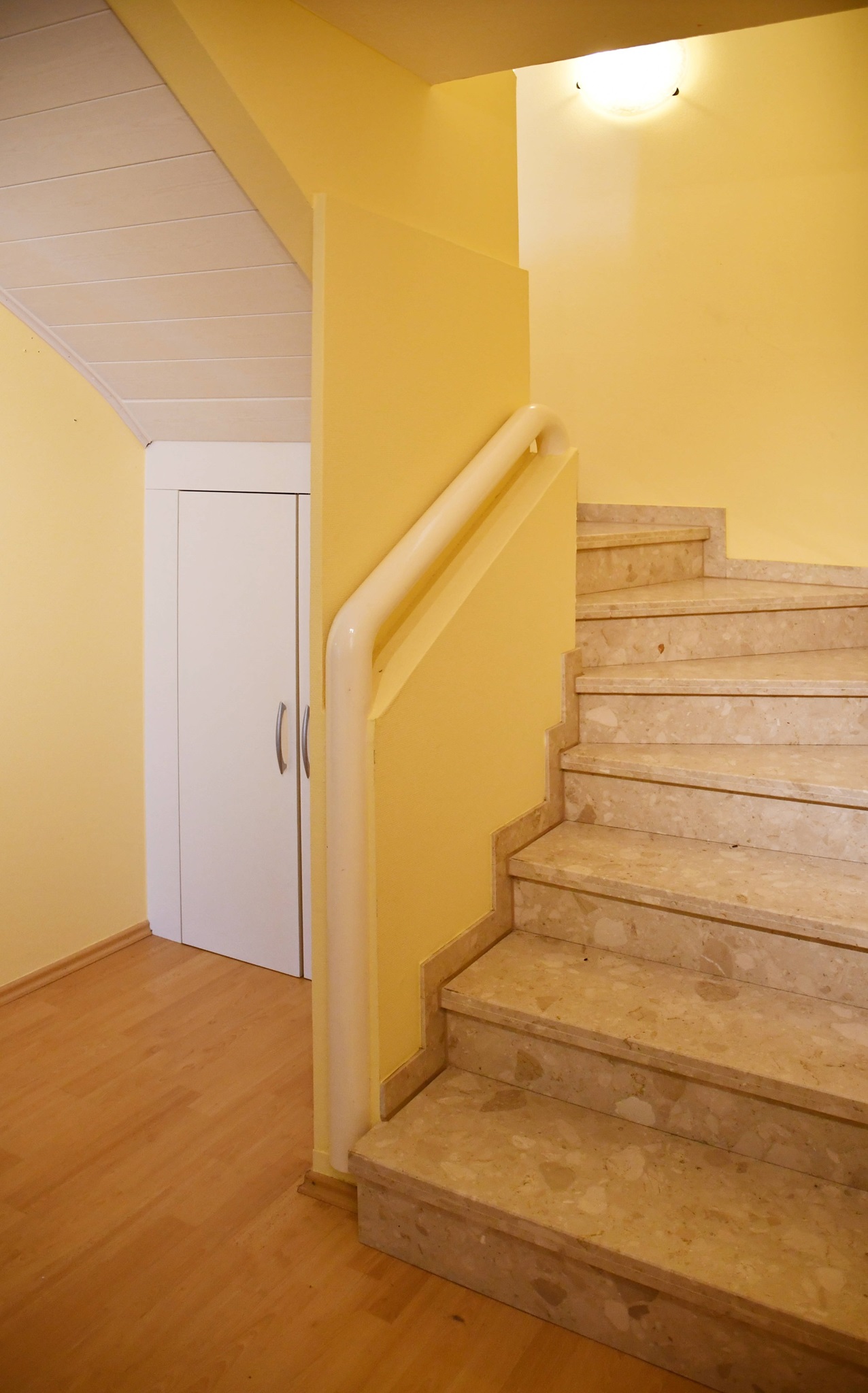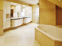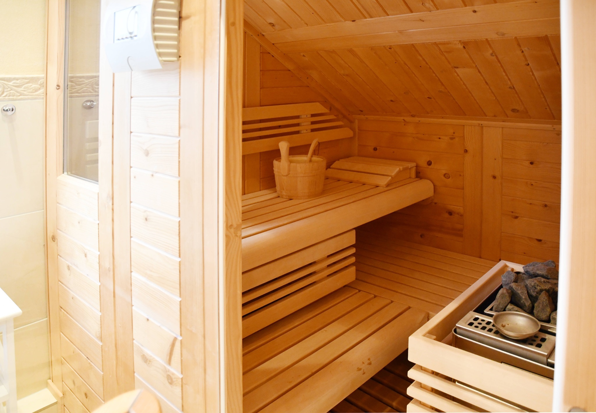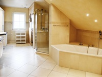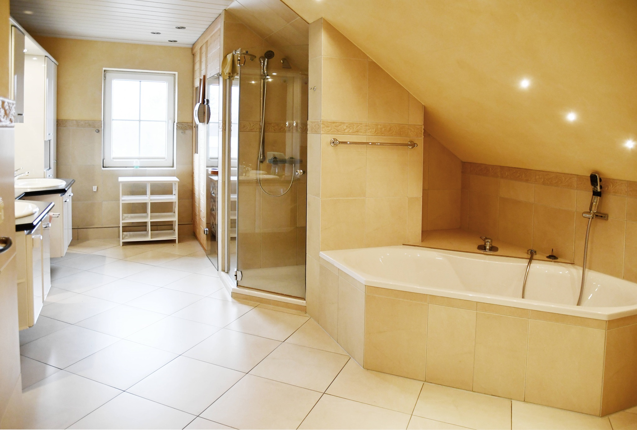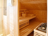 Insgesamt verfügt diese Ebene über circa 99 Quadratmeter. Vom Wohnbereich führt eine seitliche Treppe hinauf zum Schlafzimmer mitsamt separatem Ankleidezimmer und einem WellnessBadezimmer. Es bietet mit eigener Sauna, Dusche, Badewanne, ausgesuchten Fliesen und zwei Waschbecken ein 5 SterneAmbiente. Hier können Sie vom Alltag entspannen und neue Kraft schöpfen.