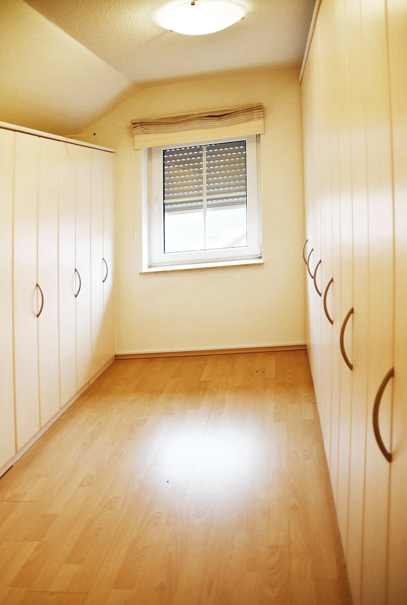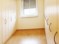 Die klassische Gestaltung des Schlafzimmers setzt sich im Ankleidezimmer mit Einbauschränken fort. Auch dieses Zimmer besitzt ein Fenster. Insgesamt garantiert dieser Bereich pure Privatheit und einen schönen Rückzugsort.