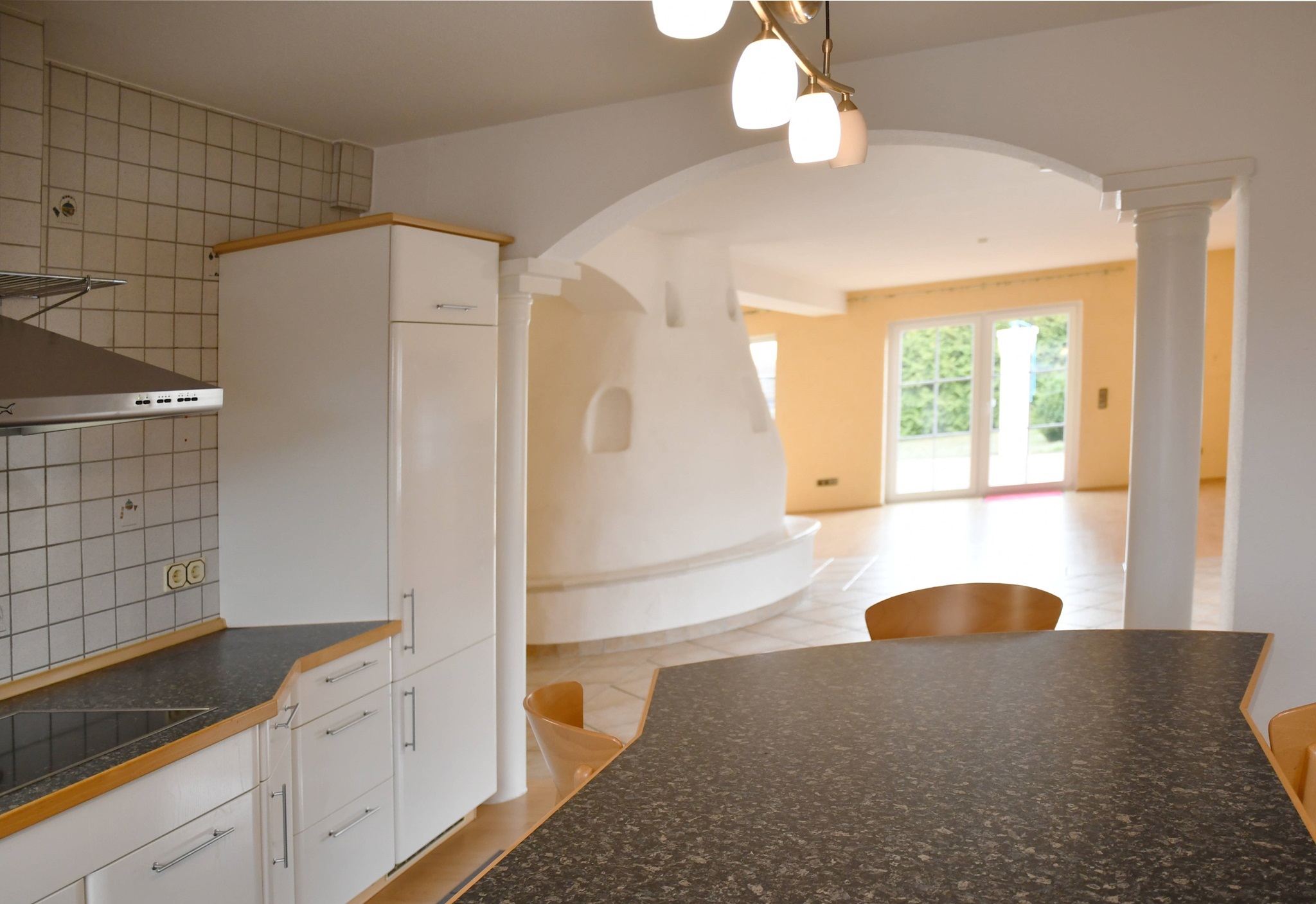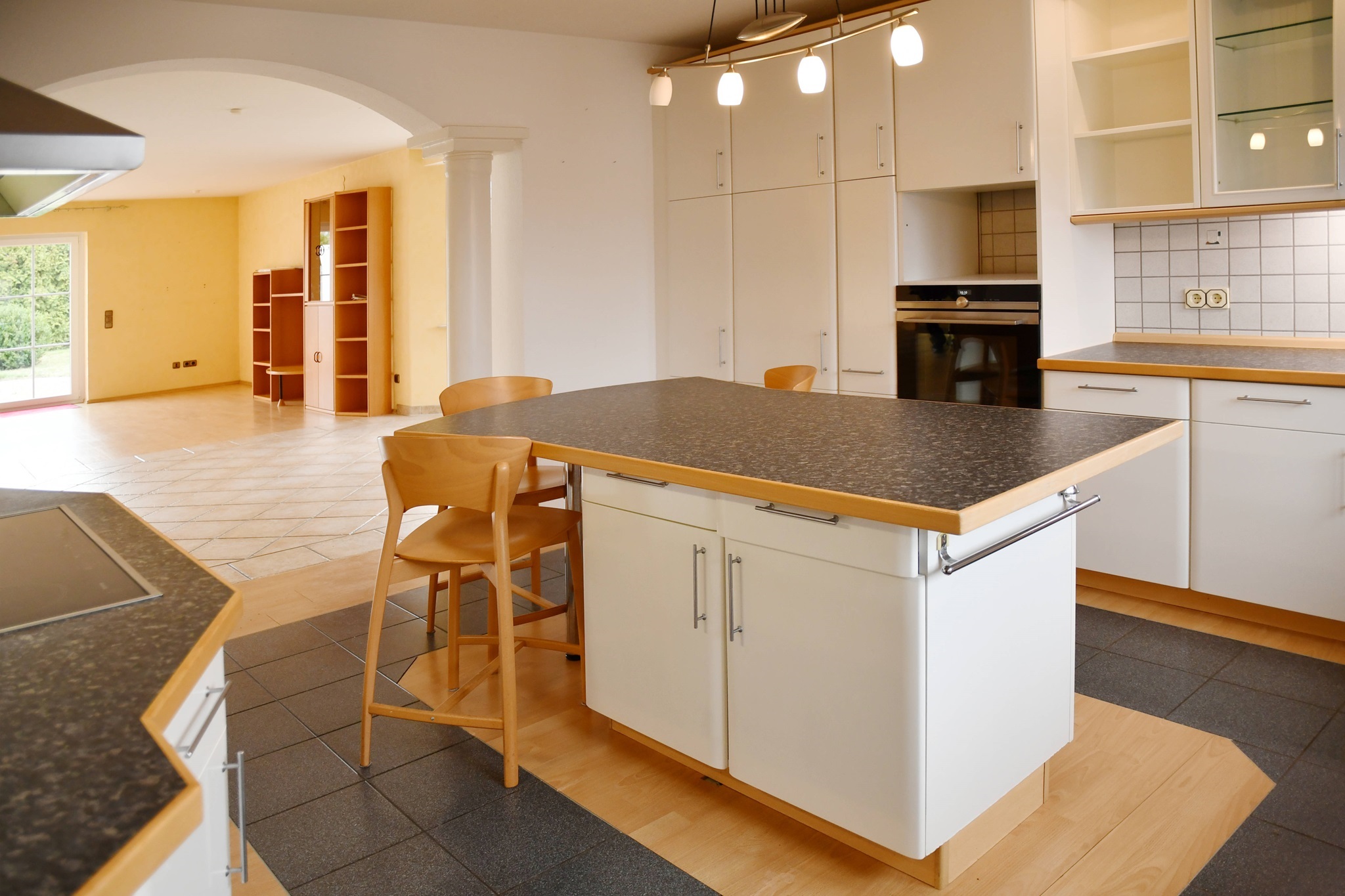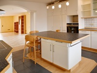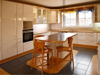 Ein weiteres Highlight auf dieser Ebene ist die moderne, hochwertige Einbauküche, denn sie verfügt über ein CeranKochfeld, Dunstabzugshaube, einen Backofen auf Arbeitshöhe, eine Spülmaschine und viel Stauraum. Darüber hinaus ist der Küchenblock für ein schnelles Frühstück und gemeinsames Kochen ideal geeignet. Seitlich schließt eine praktische Speisekammer an.