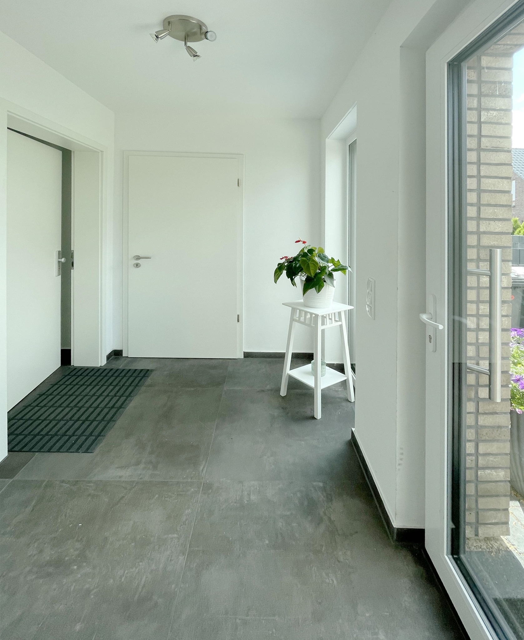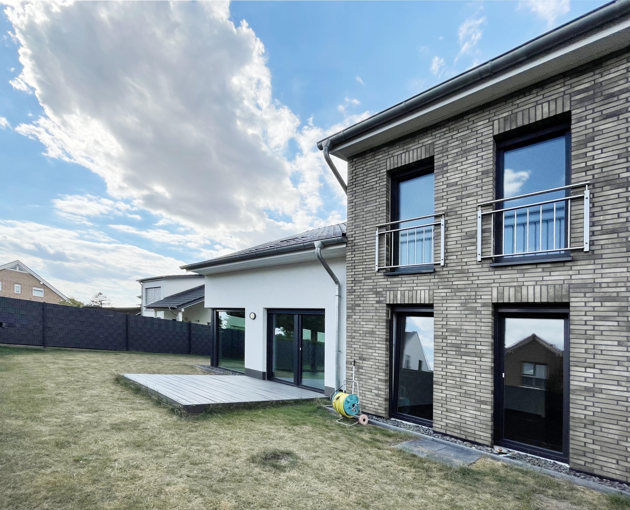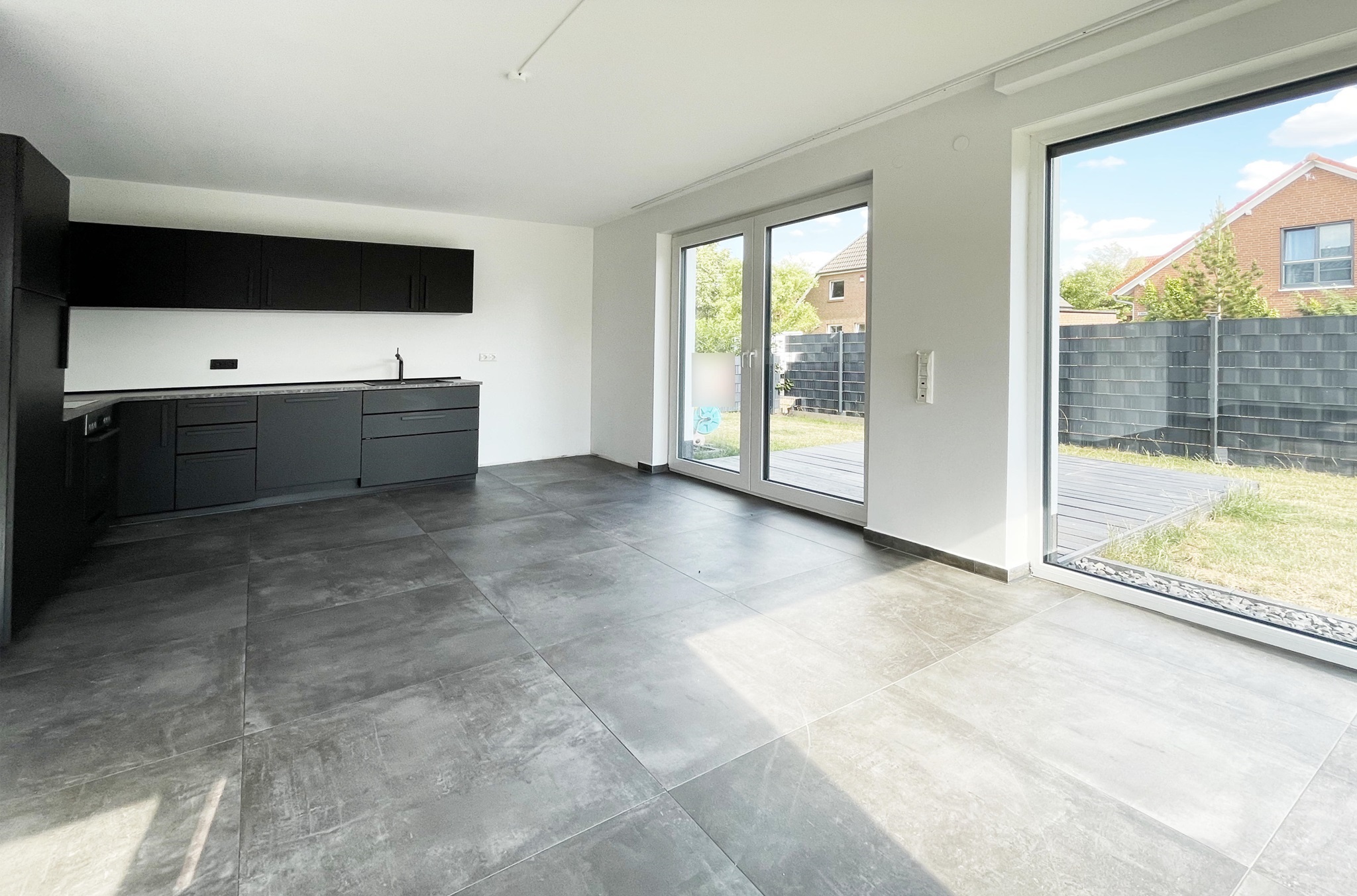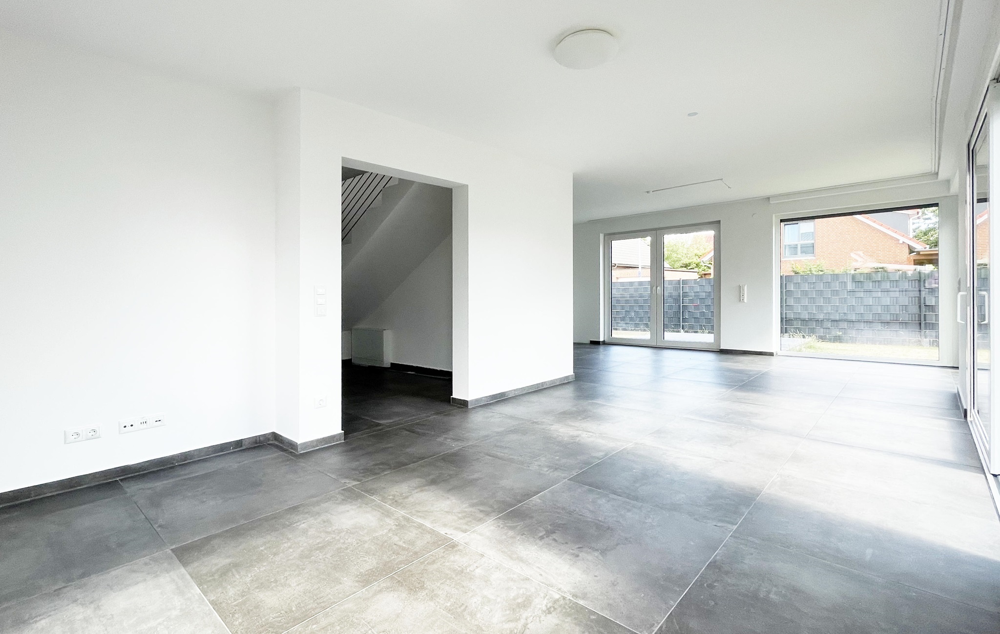Im Erdgeschoss gelangen Sie vom freundlichen und hellen Eingangsbereich in den großzügigen Wohn-/Essbereich, der durch bodentiefe Fenster zur Terrasse und zum Garten hin zum Verweilen einlädt. Seitlich haben Sie die offene Küche mit einer hochwertigen Ausstattung die vom Vormieter für eine Abstandszahlung von 2.000 € übernommen werden kann. Die L-förmige Küche im modernen Look besitzt einen Backofen, ein Cerankochfeld, eine Dunstabzugshaube, Oberschränke und eine Spülmaschine. Reichlich Stauraum und Arbeitsfläche lassen keine Wünsche offen. Der anschließende Wohnbereich bietet Platz für einen Esstisch und eine gemütliche Sitzgruppe. Im Erdgeschoss haben Sie außerdem ein Gäste-WC und ein Gästezimmer oder Büro. Über das freundliche Treppenhaus gelangen Sie in das Obergeschoss, wo Sie neben dem modern ausgestatteten Familienbad sowohl zwei Kinderzimmer als auch das ruhige Elternschlafzimmer vorfinden. Das Tageslicht-Badezimmer verfügt über Badewanne und eine bodengleiche Dusche, Waschbecken und stilvolle Armaturen.