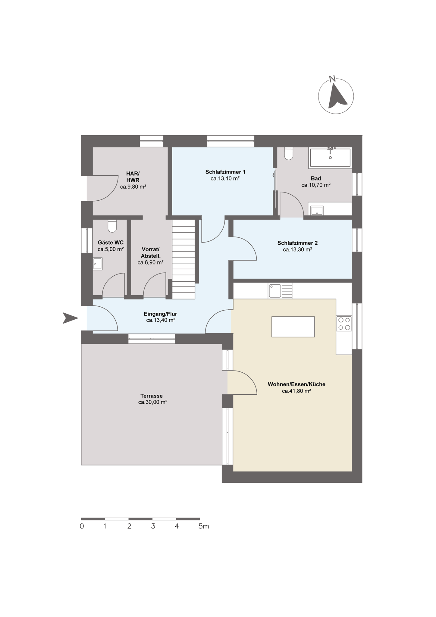 Vom weiträumigen Eingangsbereich aus gelangen Sie in den großzügigen Koch-Wohn-Essbereich, der durch bodentiefe Terrassentüren und Fenster zu zwei Seiten lichtdurchflutet zum Verweilen einlädt. Der langgestreckte Raum lässt sich ideal in eine gemütliche Sofaecke und einen Essbereich einteilen. Stets haben Sie einen schönen Blick auf die Terrasse. Ein Traum für jeden Hobbykoch ist der seitlich anschließender Kochbereich, denn der bietet mit Ceran-Kochfeld, Backofen auf Arbeitshöhe, Spülmaschine und Kühlschrank eine komfortable Ausstattung. Darüber hinaus bietet die moderne Küche reichlich Stauraum und Arbeitsfläche.