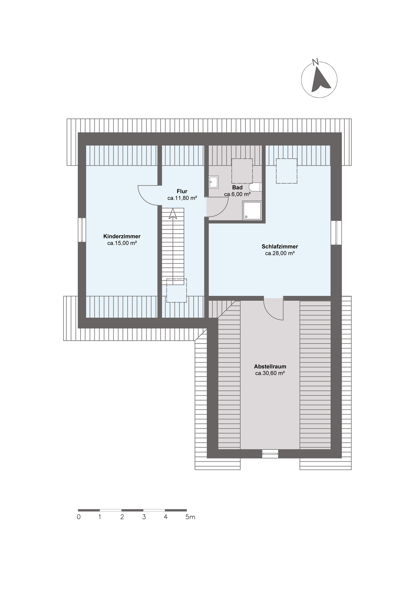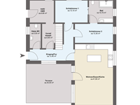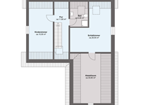 Im Erdgeschoss befinden sich außerdem ein helles Arbeitszimmer, ein Schlafzimmer, das Tageslicht-Badezimmer mit bodengleicher Dusche, ein Gäste-WC und ein separater Hauswirtschaftsraum mit Zugang zum Garten. Über das freundliche Treppenhaus gelangen Sie in das Obergeschoss, wo Sie neben dem großzügig ausgestatteten Familienbad, mit Dusche, sowohl ein Kinderzimmer als auch das ruhige Elternschlafzimmer vorfinden. Die Zimmer sind angenehm hell und die Dachschrägen sorgen für eine gemütliche Stimmung.