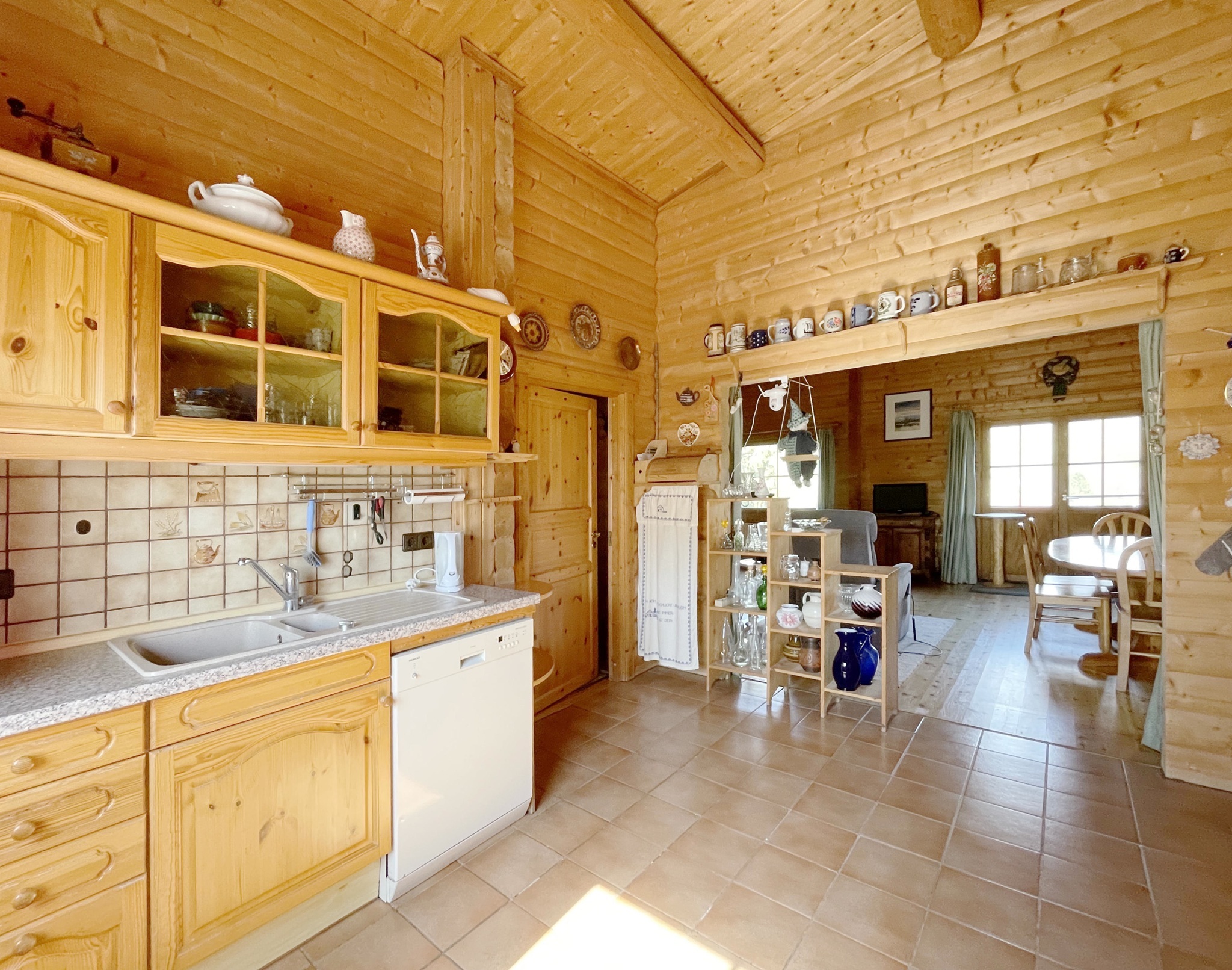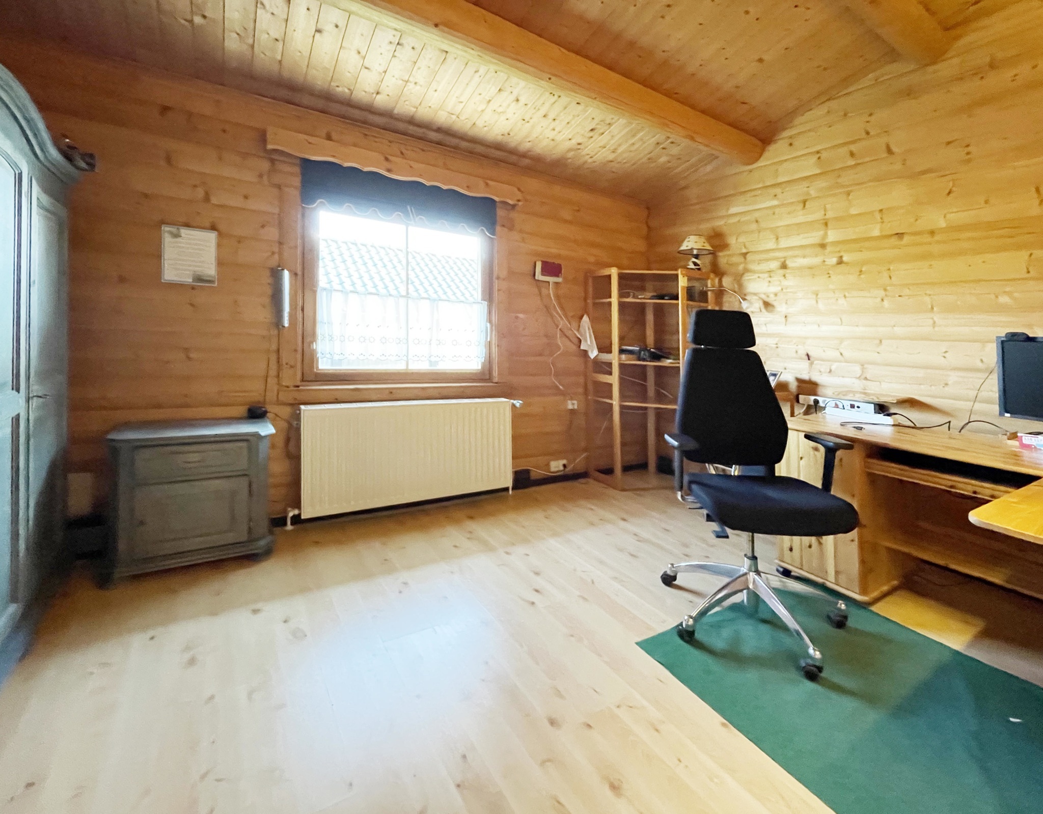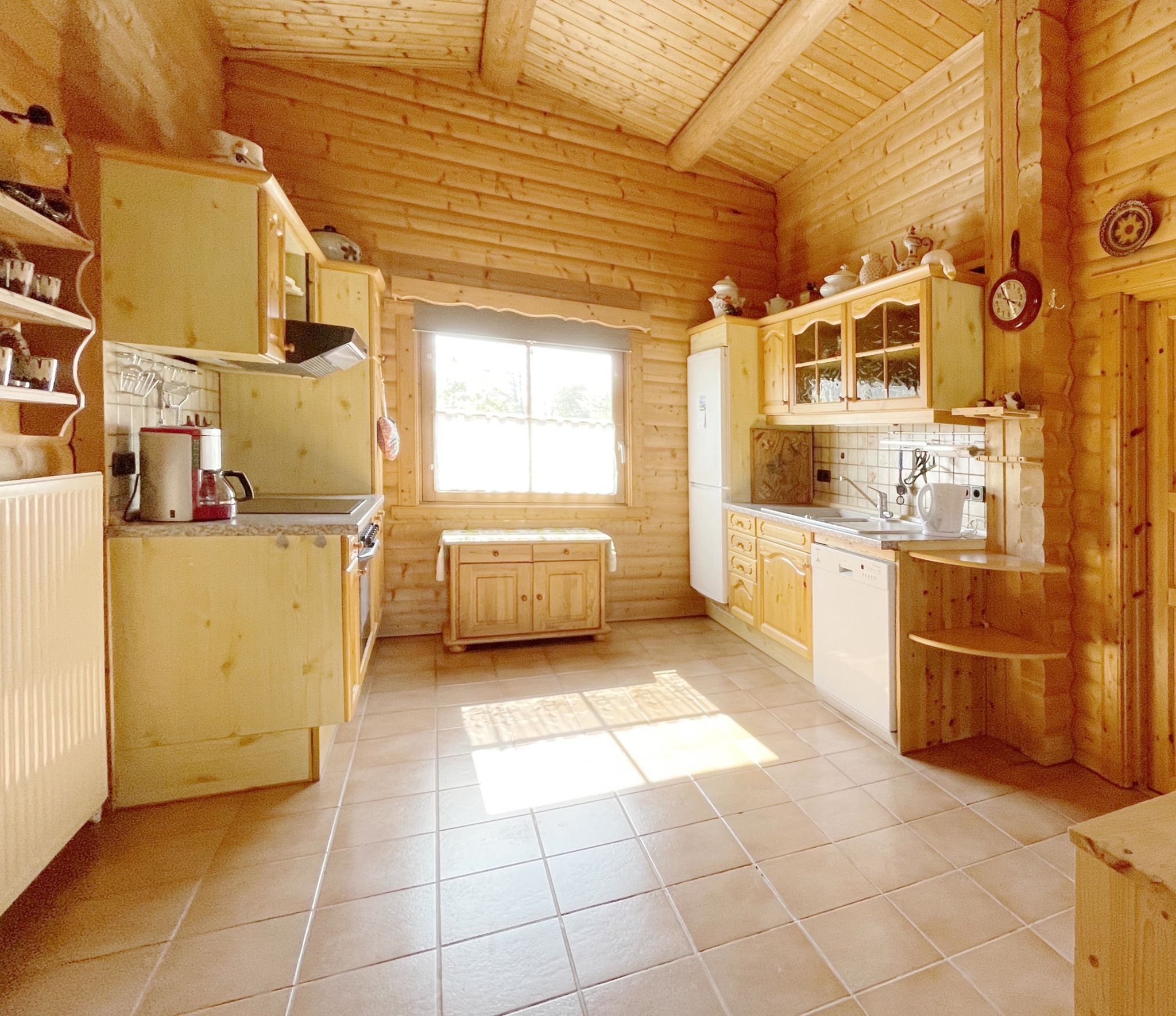 Das in Holzbauweise errichtete Haus umfasst die obere Ebene, während das massive Sockelgeschoss als Einliegerwohnung gebaut wurde. Auf der oberen Ebene empfängt Sie die Schönheit natürlichen Holzes. Ob an den Wänden, an der Decke oder auf dem Boden, stets ist das helle Holz das gestaltende und wohltuende Element. Highlight ist der offene Wohnbereich mit Verbindung zur Küche und Zugang zum großen Balkon und dem seitlichen Wintergarten. Wie bei einem Chalet ist die Holzdecke sichtbar und erreicht am höchsten Punkt fast die doppelte Raumhöhe.